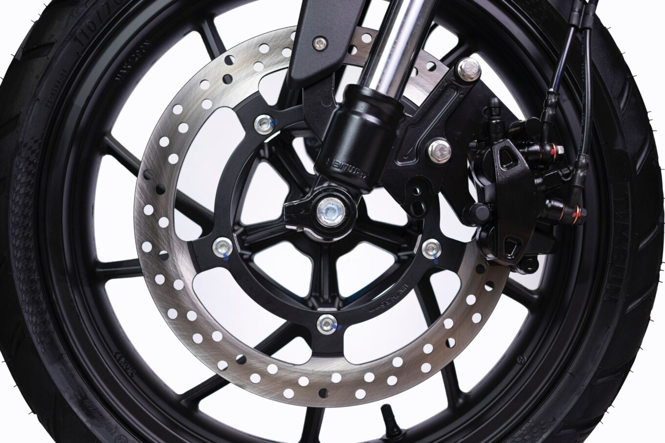 Motocykl ma też adekwatne do ceny zawieszenie. Przedni widelec up-side-down i centralny amortyzator – monoshock z tyłu, zadbają o komfortowe pokonywanie nierówności. Na uwagę zasługuje także duża tarcza hamulcowa z przodu, ma ona 300mm średnicy. Niestety oferowany motocykl nie posiada ABS, jedynie CBS.