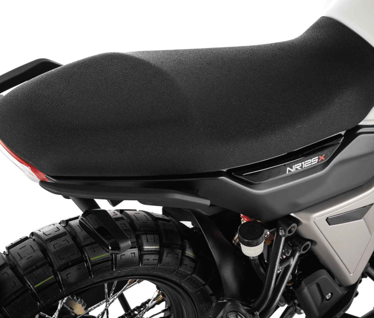 Tak samo, jak model NR125, wersja X nie posiada bagażnika w standardzie. Jednak uchwyty widoczne pod kanapą mogą bardzo dobrze służyć do przymocowania rolki bagażowej. Za resorowanie tylnego koła odpowiada oczywiście amortyzator typu monoshock. Rozwiązanie takie oprócz efektu wizualnego zwiększa stabilność tylnego koła w zakrętach.