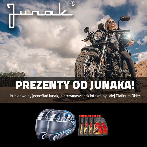 W jego skład wchodzi kask integralny z blendą Junak oraz 5 L oleju Platinum Rider do Twojego nowego jednośladu.