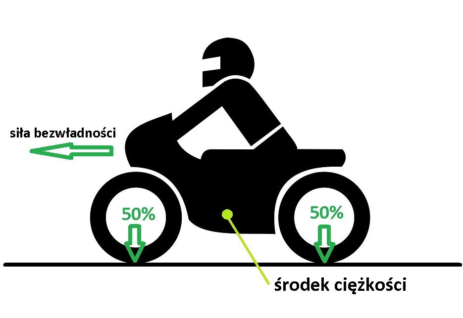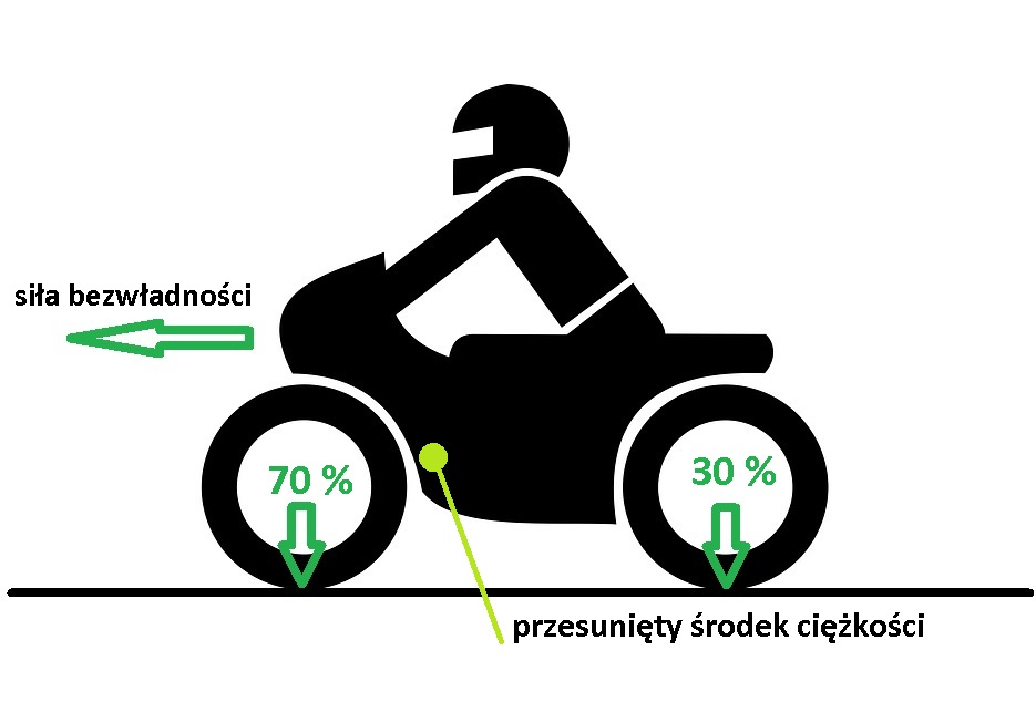 Załóżmy teraz sytuację odwrotną. Zaczynając hamowanie przednim hamulcem, środek ciężkości, dzięki sile bezwładności, zaczyna przesuwać się do przodu. Powoduje to dociążenie przedniego koła, które zyskuje lepszą przyczepność. W momencie gdy przednie koło uzyskuje lepszą przyczepność możemy mocniej przycisnąć przedni hamulec bez obawy o poślizg. Oczywiście w sytuacji awaryjnej powinniśmy się posiłkować również tylnym hamulcem, mając jednak na uwadze iż tylna opona ma dużo mniejszą przyczepność niż przednia. Z tego samego też powodu producenci motocykli montują większą tarczę hamulcową z przodu a mniejszą z tyłu.
