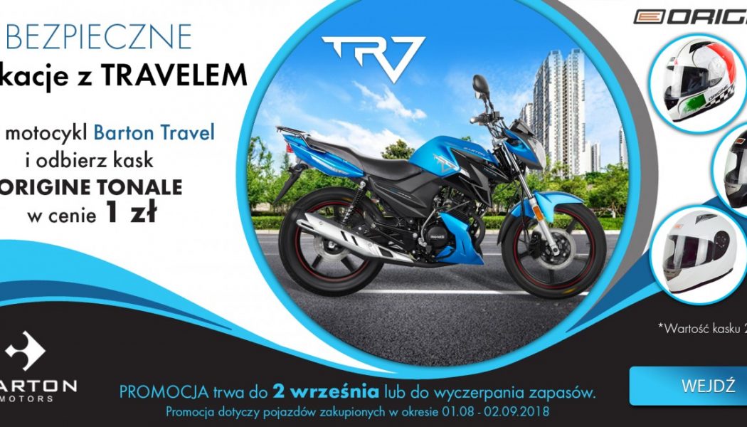 Barton postanowił pójść za ciosem i po sukcesie akcji „Pakiet Startowy” ogłasza kolejną promocję! Tym razem padło na model Travel, który będzie świetnym towarzyszem podczas wakacyjnych wypadów za miasto. Kupując ten motocykl w dniach od 1 sierpnia do 2 września wystarczy zarejestrować zakup na stronie www.barton-motors.pl/wakacje-z-travelem, aby otrzymać kask za złotówkę!