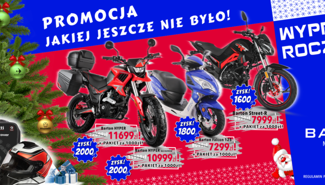 Zainteresowanie naszą mikołajkową akcją nie maleje. Postanowiliśmy więc uatrakcyjnić mikołajkową promocję dokładając obniżkę cen wybranych modeli Bartona. To z pewnością doskonała okazja, aby skorzystać z wyjątkowej oferty na pojazdy Barton Motors dedykowane posiadaczom prawa jazdy kategorii B. 1000 zł taniej za cieszący się świetnymi opiniami właścicieli motocykl turystyczny Barton Hyper 125 (z kuframi lub bez), […]