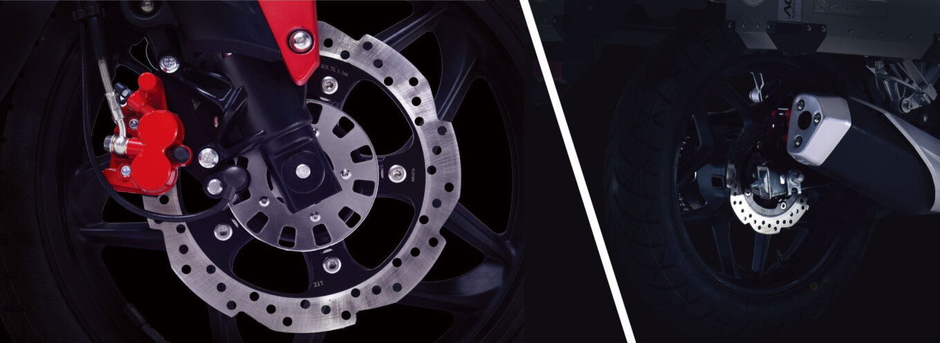 Motocykl wyposażono w przednie zawieszenie typu up-side-down, co oczywiście zapowiada dobre radzenie sobie z nierównościami nawierzchni. Tylne zawieszenie oparto na pojedynczym amortyzatorze centralnym (monoschock). Zastosowanie takiego układu zwiększa stabilność w zakrętach oraz poprawia optykę pojazdu. Za zatrzymanie motocykla odpowiada dwutarczowy układ hamulcowy z ABS. Swoją drogą ciekawe czy importer zaproponuje pojemność 200cc w Polsce. W motocyklach o pojemności większej niż 125 wymaga się montażu układu ABS. Motocykl wyposażono również w pełne oświetlenie LED.