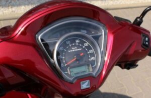 Podobnie do starszych Hond SH kierownica obudowana z analogowym licznikiem i standardowymi kontrolkami. Jednak na dole znalazł się mały wyświetlacz LCD, na którym odczytamy przebieg i poziom paliwa w baku. Rozwiązaniem niewątpliwie ułatwiającym eksploatacje jest nieobudowany zbiorniczek płynu hamulcowego. Na zdjęciu z lewej strony licznika widoczny jest przycisk wyłączania systemu Start&Stop.