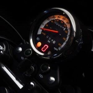 Tu prostota osiągnęła szczyt. Przyrządy pokładowe to jeden klasyczny zegar oraz dwie lampki kierunkowskazów pomiędzy puszką, a stacyjką.na górnej półce przedniego widelca. Na analogowym zegarze ilość kontrolek również należy uznać za minimalną. Znalazły się tu lampka rezerwy, długich świateł i check engine. Brakuje lampki neutrala, ma ją zastąpić wyświetlacz aktualnie zapiętego biegu. Z doświadczenia z moim motocyklem 125, mogę stwierdzić, że czasem wyświetlacz żył swoim życiem, niezależnie od zapiętego biegu i większe miałem zaufanie do zielonej N. Podświetlenie lampek i samego licznika również wygląda na żarówki, a nie diody LED. Optymistycznym należy określić wyskalowanie prędkościomierza, zakres do 120km/h zdecydowanie by wystarczył.