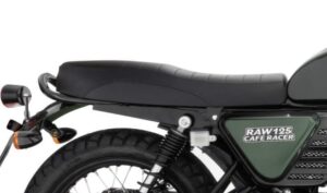 Przeglądając katalog Junaka, mam wrażenie lekkiego deja vu za sprawą modelu Junak RAW 125. Motocykl surowy w nazwie i w wyglądzie ta surowość uderza, zwłaszcza w porównaniu do typowych obecnie standardów podstawowych modeli. Importer oferuje ten model w kolorach czarnym, zielonym, matowych czarnym i szarym (grafitowym), oraz dwubarwnym czarno-czerwonym. Mimo, że ten ostatni brzmi ciekawie, to jednak na mnie największe wrażenie robi szary mat. Napis na bocznym deklu sugeruje, że motocykl ma być pozycjonowany jako Cafe Racer. Wysoka kierownica, podwójna kanapa, kostkowe opony i krótki błotnik, bardziej przypominają mi Scramblera. Wcześniej model RAW występował tylko w pojemości 50cc, cieszy, że dołączył także do grupy motocykli o pojemności 125cc.