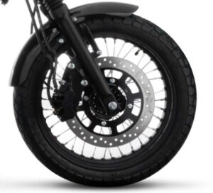 Przód to klasyczne amortyzatory z stylowymi gumowymi osłonami, tył prowadzony na podwójnych amortyzatorach olejowych z progresywnymi sprężynami. Zawieszenie proste i praktyczne, zapewni komfortową jazdę na niezbyt równych asfaltowych drogach, a i po za asfaltem nie powinno za wcześnie skapitulować. Bieżnik opon także nie wygląda na taki, który boi się błota, czy innych luźnych nawierzchni. Na mokrym asfalcie, może trzeba będzie jechać odrobinę rozważniej, ale ciężko tutaj o złoty środek.