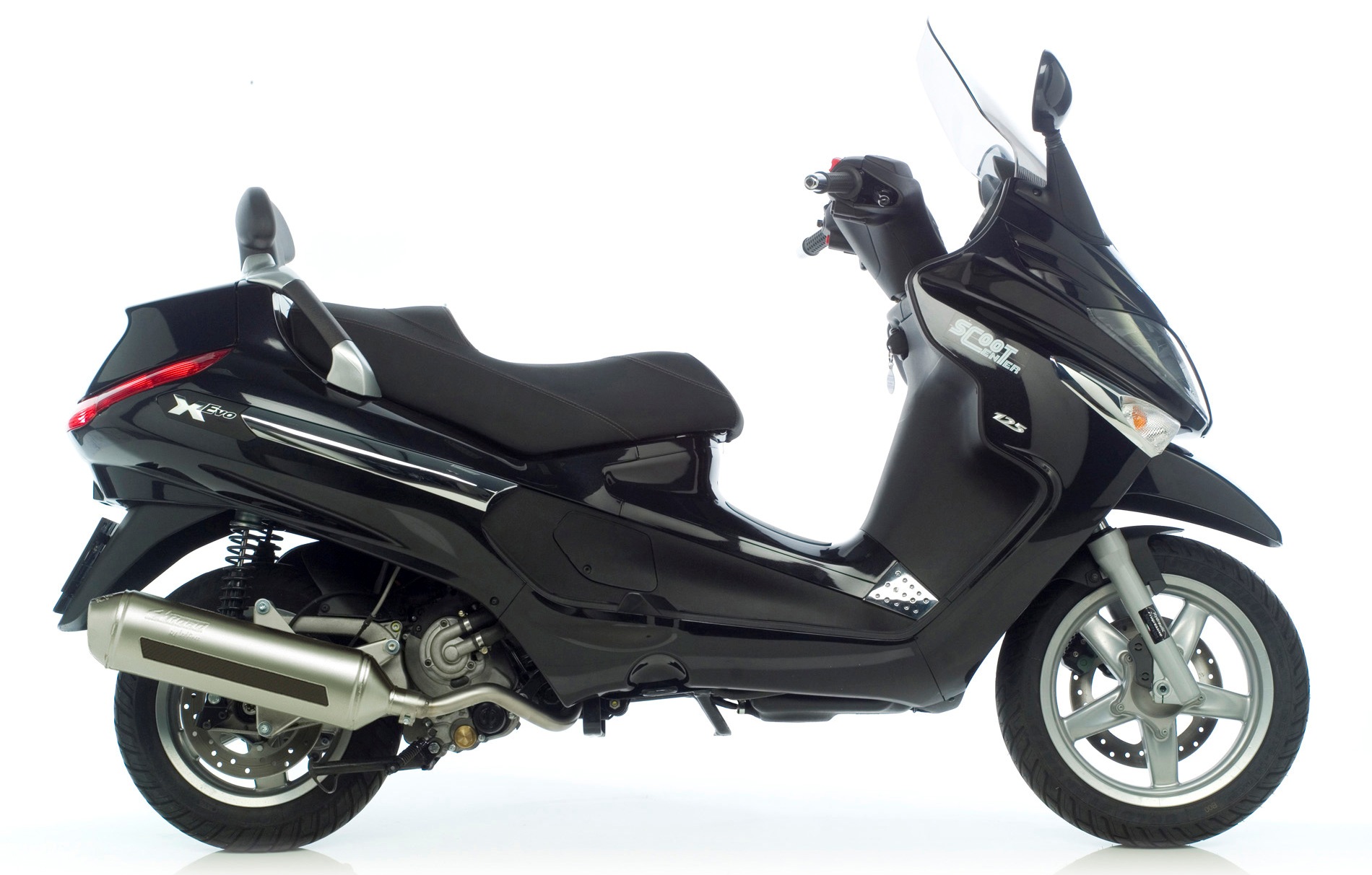 Piaggio Xevo to bezpośredni następca modelu X8, jednak posiada także sporo cech od X9, np komputer pokładowy i wyświetlacz LCD z wieloma informacjami dla kierowcy. W tym modelu znajdziemy takie bajery, jak otwierany z pilota schowek, który jest tak wielki, że słowo schowek przestaje do niego pasować. Zmieścisz w nim dwa pełne kaski lub przedmioty o długości 80cm. Gitara raczej nie wejdzie, ale mandolinę już zmieścisz. W schowkach mamy podświetlenie i specjalne miejsce na pokrowiec, który chroni naszą maszynę przed deszczem i palącym słońcem. Natomiast w przednim schowku znajdziemy miejsce dla kilku drobiazgów, oraz gniazdko 12V do ładowania telefonu, lub też nawigacji. Ten skuter został zaprojektowany nie tylko z myślą o kierowcy. Pasażer będzie się na nim czuł bardzo komfortowo, ma bowiem swoje oparcie i wyprofilowane podnóżki, ale wyjątkowe jest to, że ma także uchwyty w tylnej kanapie. Jeżeli potrzebujesz podwieźć kogoś z pracy i nie chcesz aby ten ktoś cię obejmował, będzie mógł się trzymać tych uchwytów pozostawiając nienaruszoną twą nietykalność. Z technicznego punktu widzenia, na uwagę zasługują świetne hamulce. Przednia tarcz hamulcowa ma 260mm. Taka sama montowana jest także w mocniejszej wersji z silnikiem 250. Co do jakości wykonania, to możemy spodziewać się górnej półki, chociażby ze względu na cenę, która nie ma sobie równych w stajni Piaggio. Ale także rodowód włoskiego producenta każe przypuszczać, że będzie to trwały sprzęt. Jako minus zaliczamy tylko wysokie spalanie które sięga 4 litrów. Jednak to jest skuter klasy biznes, zatem tutaj liczy się bardziej, komfort i moc niż ekonomia.
