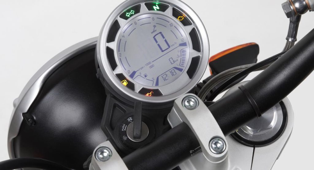 Prędkościomierz mimo że wydaje się mały gabarytowo, zawiera całkiem sporo informacji. Oprócz standardowych wskazań prędkości, obrotów silnika i przebiegu motocykla, mamy tutaj temperaturę cieczy chłodzącej, zegarek, a nawet wskaźnik rozłożonej stopki bocznej. Brakuje wskazań aktualnie zapiętego biegu. Przy 6-cio stopniowej skrzyni biegów, może być to problematyczne dla początkującego kierowcy.