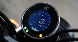 Yamaha XSR 125 na desce rozdzielczej ma pojedynczy licznik ciekłokrystaliczny z ładnym niebieskim tłem, z widocznym obrotomierzem,