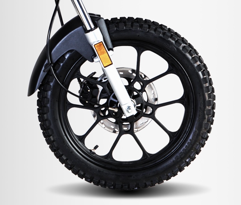 Zipp trackerNa pierwszy montaż w tym motocyklu są stosowane opony CST (Cheng Shin Tire) i choć są to jedne z lepszych opon montowanych w Chińczykach, bo na pierwszy montaż używa ich często Honda (model CB125) to w przypadku używania motocykla również na szosie trzeba rozważyć zmianę przynajmniej przedniej opony. Przednia opona jest typowo terenowa czyli tak zwana kostka, nie zapewni nam ona dobrej przyczepności podczas jazdy w deszczu na gładkiej asfaltowej powierzchni za to będzie się pięknie wgryzać w kopny piasek. Tylna opona to opona o bieżniku dual-purpose czyli uniwersalnym, który powinien sprawdzić się w lekkim terenie ale też zapewnić minimum przyczepności na asfalcie. W przedniej lampie znajdziemy już żarówkę halogenową, a przednie kierunkowskazy są wkomponowane w obudowę baku. Dzięki temu przód motocykla zyskuje  agresywny i nowoczesny wygląd. Tylna lampa jest rozwiązana klasycznie na standardowej dwuwłókowej żarówce.