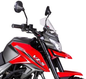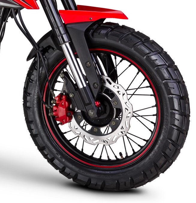 Komfort zapewnia też przedni widelec typu upside-down i tylni amortyzator centralny tak zwany monoshock. Projektanci tego motocykla chcieli żeby motocykl był uniwersalny. Na pierwszy rzut oka widzimy, że opony są szerokie, to ma zapewnić dobrą przyczepność do asfaltu. Jednak są one również kostkowane, czyli nie powinny zakopywać się w lekkim terenie. Niestety są to opony na rynek Chiński gdzie asfalt jest szorstki i twarde opony na dłużej wystarczają. W naszych warunkach drogowych te opony nie za dobrze trzymają się drogi. Jeśli nie masz pieniędzy żeby przy zakupie motocykla wymienić opony na markowe to musisz się pilnować, szczególnie podczas deszczu.