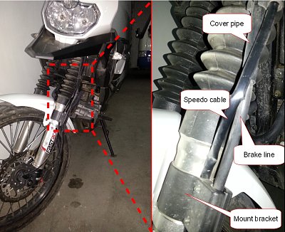 Małe podsumowanie po 1000km, pojemność baku podawana przez producenta to 19 litrów, ale nie chce mi się wierzyć, według moich obserwacji maksymalnie zmieściłem 12,7 litra, plus 1-2 litry rezerwy da nam maksymalnie 15 litrów. Zasięg na pełnym baku do rezerwy wyniósł 265km. Maksymalną prędkość uzyskałem na 5-tym biegu przy 6,5tys. obr. wyniosła 125km/h. Średnie spalanie wyniosło 4,78 litra /100km, trochę terenu i trochę szosy, ale zawsze z manetką do oporu. Po kolejnych 200km wykryłem usterkę krytyczną, przecierający się przewód hamulcowy.