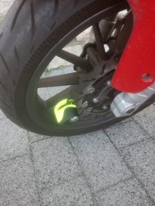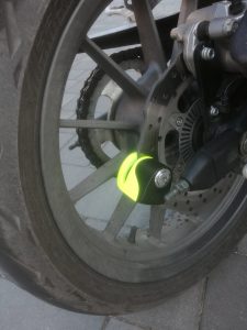 Dla osób takich jak ja, które czasami zapominają kasku wychodząc pojeździć motocyklem, i później muszą się wracać z garażu, producent przewidział blokadę w rzucającym się w oczy kolorze. Dla wszystkich innych, którzy doskonale pamiętają o tym, że mają blokadę na kole dostępne są kolory srebrne oraz czarne. Odjechanie motocyklem z blokadą założoną na tarczę hamulcową może skutkować uszkodzeniem tarczy i jej kosztowną wymianę. Więc warto zaopatrzyć się w linkę przypominającą.