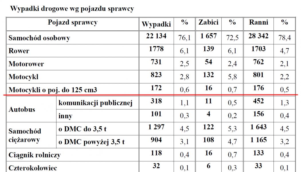 Znalazłem jeszcze lepsze źródło. Według PZM w rocznym raporcie z 2016, motocykle 125 stanową 21% parku wszystkich motocykli który liczy sobie 1271600. W artykule podałem 225 000 motocykli 125, a okazuje się że jest ich aż 272122! A to jest udział na poziomie 1%. Ale powiedzmy że 125-tka robi mniej kilometrów niż inne pojazdy więc nadal bezpieczeństwo jest porównywalne. Poprawię artykuł.