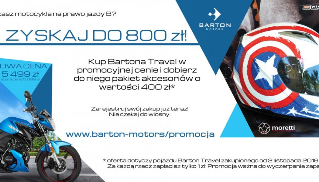 Barton Motors w tym roku wyjątkowo dba o swoich klientów. Po sukcesie wiosennej akcji, gdzie do każdej 125-tki można było dobrać Pakiet Startowy o wartości 400 zł, postanowili, że jesienią również dadzą klientom taką możliwość. Promocją dotknięty został motocykl na kategorię B – Barton Travel. Pakiet startowy to jednak nie wszystko! Importer obniżył także jego cenę do 5 499 zł. Łącznie można więc zaoszczędzić do 800 zł – 400 zł mniej na pojeździe i 400 zł na akcesoriach.